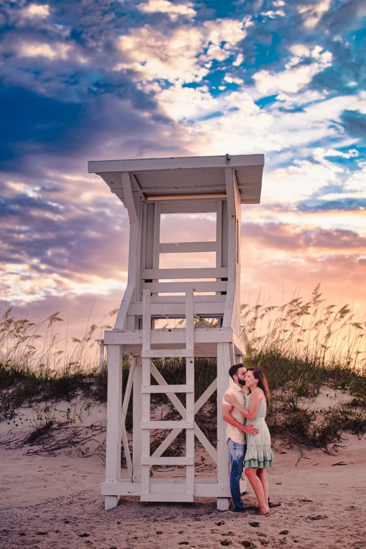 Surprise sunset proposal engagement photography session at lifeguard stand on Kure Beach, NC.